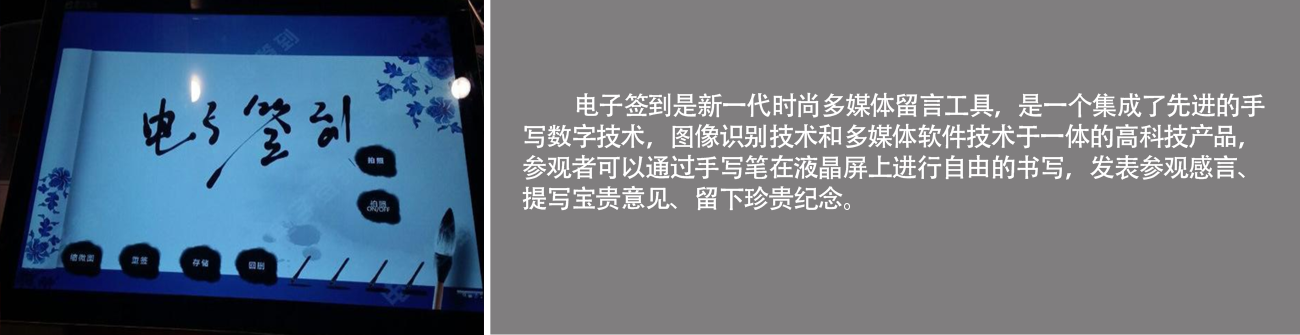 電子簽名是一種新型簽到神器,做為觸控技術的延伸,電子簽名系統是由觸摸屏和手寫互動軟件構成。可以用手指或筆在屏幕上簽字留念,配合紅外鏡頭的拍照功能,可以瞬間保存或打印出來,可用于展廳中作為簽名,留言使用,觀眾可在觸摸屏或者投影屏幕上留下自己的名字及意見等。