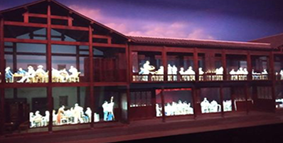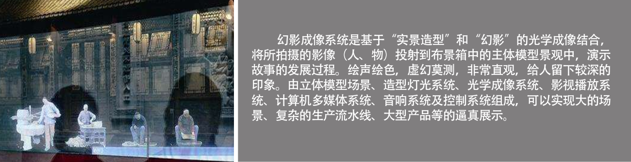 基于“實景造型”和“幻影”的光學成像結合,獲得“幻影”與實景造型結合及相互作用的逼真效果。系統由立體模型場景、造型燈光系統、光學成像系統、影視播放系統、計算機多媒體系統、音響系統及控制系統組成。