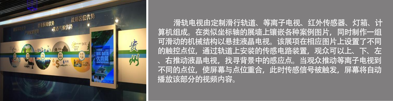 滑軌電視在類似坐標軸的展墻上鑲嵌各種展示圖片,同時制作一組滑動的機械結(jié)構(gòu)以懸掛液晶電視。通過軌道上安裝的傳感電路裝置,找尋背景中的感應(yīng)點。當觀眾推動電視到不同的點位,使屏幕與點位重合,電視屏幕上自動播放該部分的視頻介紹內(nèi)容。