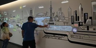 科技感強,畫面面積大,形式新穎,科技感濃郁。通過互動投影技術和感應技術,從簡單的發出聲音,到更為復雜的投影映射層的交互,甚至物理空間上的運動,組成了這一面有故事的墻,涵蓋了各個領域。