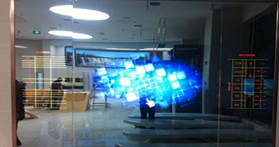 鏡面全息是采用粘貼在玻璃上或者亞克力材料商的進口的全息膜。在開始工作的時候,全息膜會配合投影的影像內容來展示產品影像資料,內容畫面通過屏幕光學處理,顯的細膩柔和。