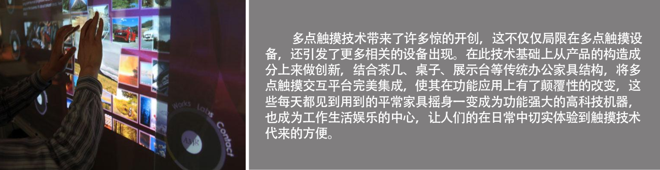 多點(diǎn)觸摸桌是通過現(xiàn)有的多點(diǎn)觸控設(shè)備來代替“鼠標(biāo)+鍵盤”的功能,實(shí)現(xiàn)手指觸摸操作,只需指尖輕觸,即可實(shí)現(xiàn)點(diǎn)擊、縮放、三維旋轉(zhuǎn)、拖拽等人機(jī)交互動(dòng)作。人們使用手和手指的手勢(shì)與多媒體內(nèi)容進(jìn)行交互,已成為全新的交互式享受。